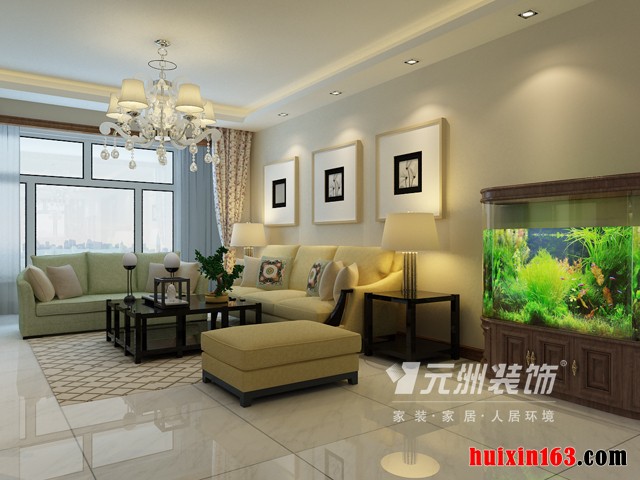 中央美域,140平米三居室,采用简约欧式装修风格,该风格的装饰应展现出一种高贵典雅的气质,在客厅的设计当中,大量的留白处理,局部适当的通过色彩来点缀,营造出一种惬意舒心的环境,拼贴式的地砖在这个没有过多造型的环境当中就显得比较独特别致,同时也是该空间的一大设计看点,米黄色的沙发布艺,黑色的茶几,沙发旁一个鱼缸的摆放,五颜六色的色彩,展现出来的是一种自然与清雅,以简洁浪漫的情调突出该风格的主题,整体感觉上给人一种身心舒畅,宁静和安逸的氛围,客厅中最大的设计亮点就是水晶吊灯的造型,不管是色彩还是样式都比较凝聚我们的眼球。