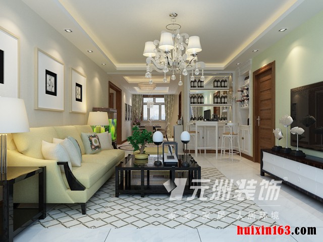 中央美域,140平米三居室,采用简约欧式装修风格,该风格的装饰应展现出一种高贵典雅的气质,在客厅的设计当中,大量的留白处理,局部适当的通过色彩来点缀,营造出一种惬意舒心的环境,拼贴式的地砖在这个没有过多造型的环境当中就显得比较独特别致,同时也是该空间的一大设计看点,米黄色的沙发布艺,黑色的茶几,沙发旁一个鱼缸的摆放,五颜六色的色彩,展现出来的是一种自然与清雅,以简洁浪漫的情调突出该风格的主题,整体感觉上给人一种身心舒畅,宁静和安逸的氛围,客厅中最大的设计亮点就是水晶吊灯的造型,不管是色彩还是样式都比较凝聚我们的眼球。