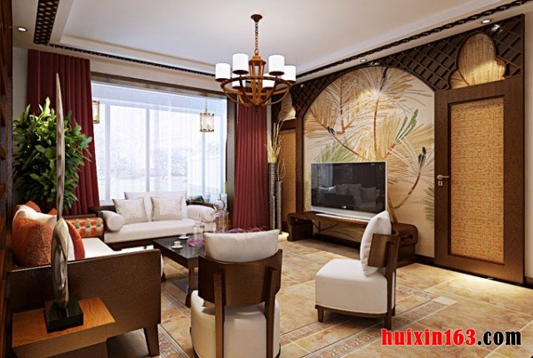 御锦源,129平米三居室,采用中式古典的装修风格,在本案例的设计当中,浓烈的色彩搭配,让空间显得比较温馨浪漫,装饰布置出来的效果一定要保证整齐恰当,不能太过于杂乱,否则会起到反面效果,在客厅的设计当中,采用平顶式的石膏板,搭配上一盏线圈式并且富有古典文化气息的吊灯,将古典的韵味展现得淋漓尽致,个性别致的电视背景墙,不管是造型的设计还是壁纸的铺贴都比较新颖别致,仿古地砖的铺设更是起到一个锦上添花的效果,精致的沙发,落地窗的设计搭配上个性的窗帘以及窗户旁一颗绿植的添加摆放,这些都是空间的设计看点。